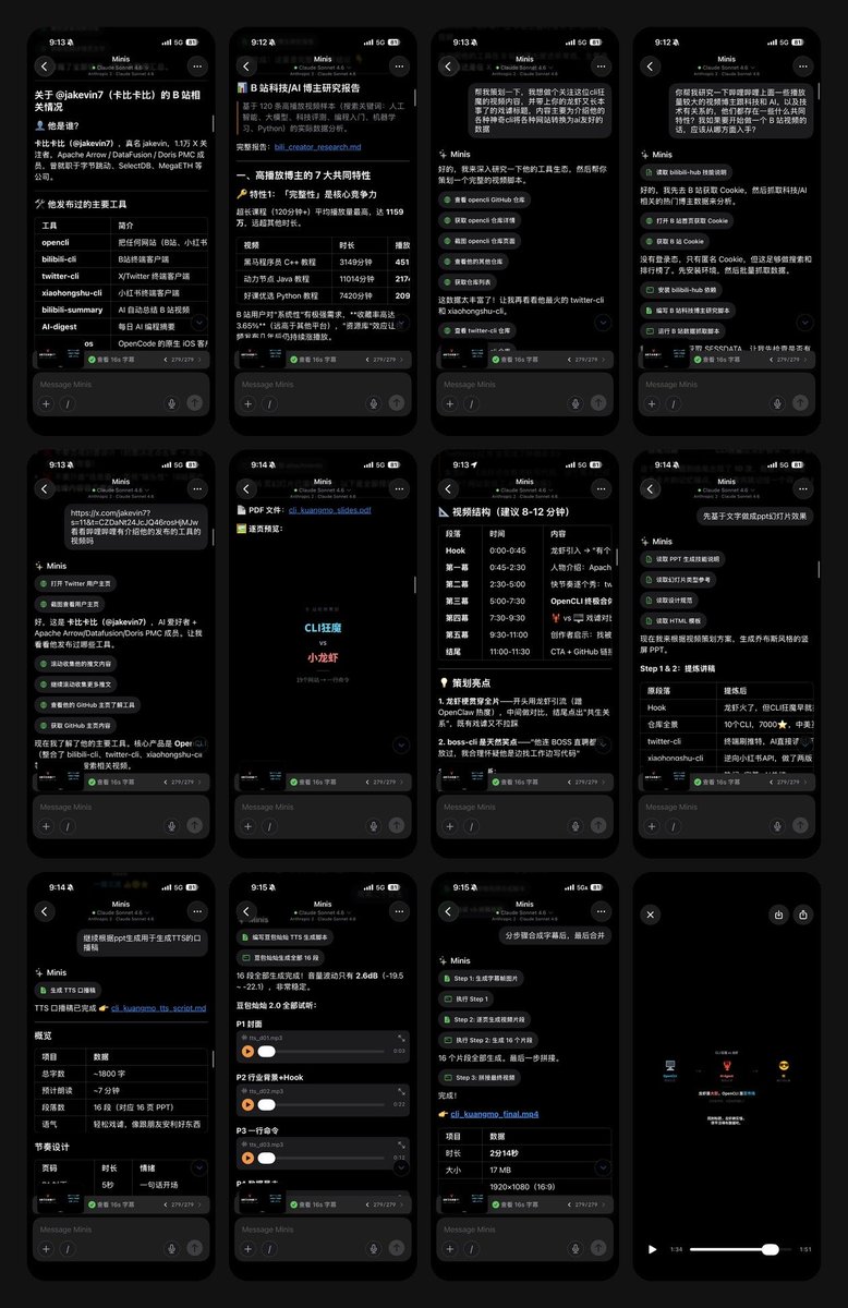 尝试全程用 Minis 跑完整个科技类视频创作,全程 Minis 根据我的视频制作方向收集资料,整理 PPT,撰写口播脚本,调用豆包 TTS 生成语音,渲染字幕,合成视频,跑了 200+ 轮工具,发 B 站看看能不能起号 [Yes]