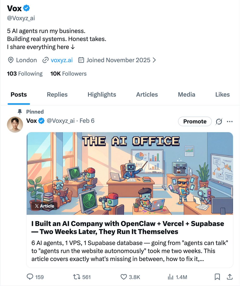 6 weeks. zero to 10k. started with one article. mid-january my timeline got invaded by lobsters. openclaw had just launched (it was called clawd bot back then). it looked like what i always imagined real AI agents should be. got obsessed. started with one loop, built a team of 6 agents, spent weeks figuring out how to make them work together, wrote about what happened. first lobsters article hit 1.4M views. no plan, no strategy. just wrote what i was actually doing. kept writing because people kept asking questions i wanted to answer. over 10 articles now, all real experience, all things that actually happened while running this system. along the way: met builders i now talk to every week, got partnership offers i never expected, built a product people actually buy, and learned more from the replies under my posts than from months of building alone. openclaw happened to launch at the right time. i happened to be the kind of person who writes things down. and you happened to care. thank you for reading, replying, DMing, sharing your own setups, and telling me when i'm wrong. genuinely. if i could go back six weeks and tell myself what's about to happen, i wouldn't believe me.