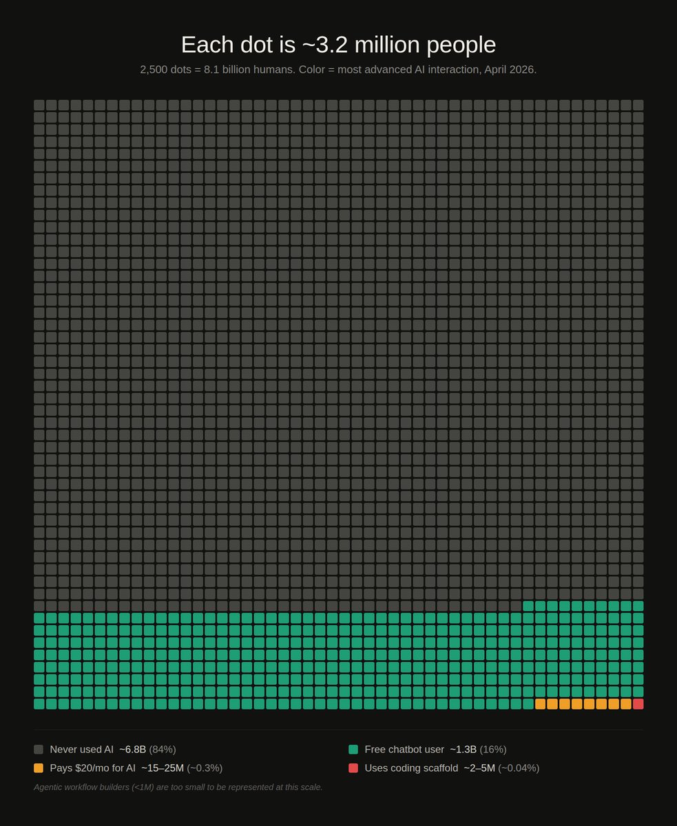 Your daily reminder that you are so early to AI. - 84% have never meaningfully touched it - 16% use a free chatbot occasionally - 0.3% pay $20/month - 0.04% use a coding scaffolding - 0.01% are just like you You're building orchestrated agents, running models at 2 am, buying hardware, and compounding your advantage every single day. Meanwhile, 99.9% of people are laughing at Mac mini buyers, OpenClaw users, and home GPU nerds. If you're part of the 0.01%, you are part of the collective building the infrastructure everyone else will depend on. The gap is accelerating. Lock in.