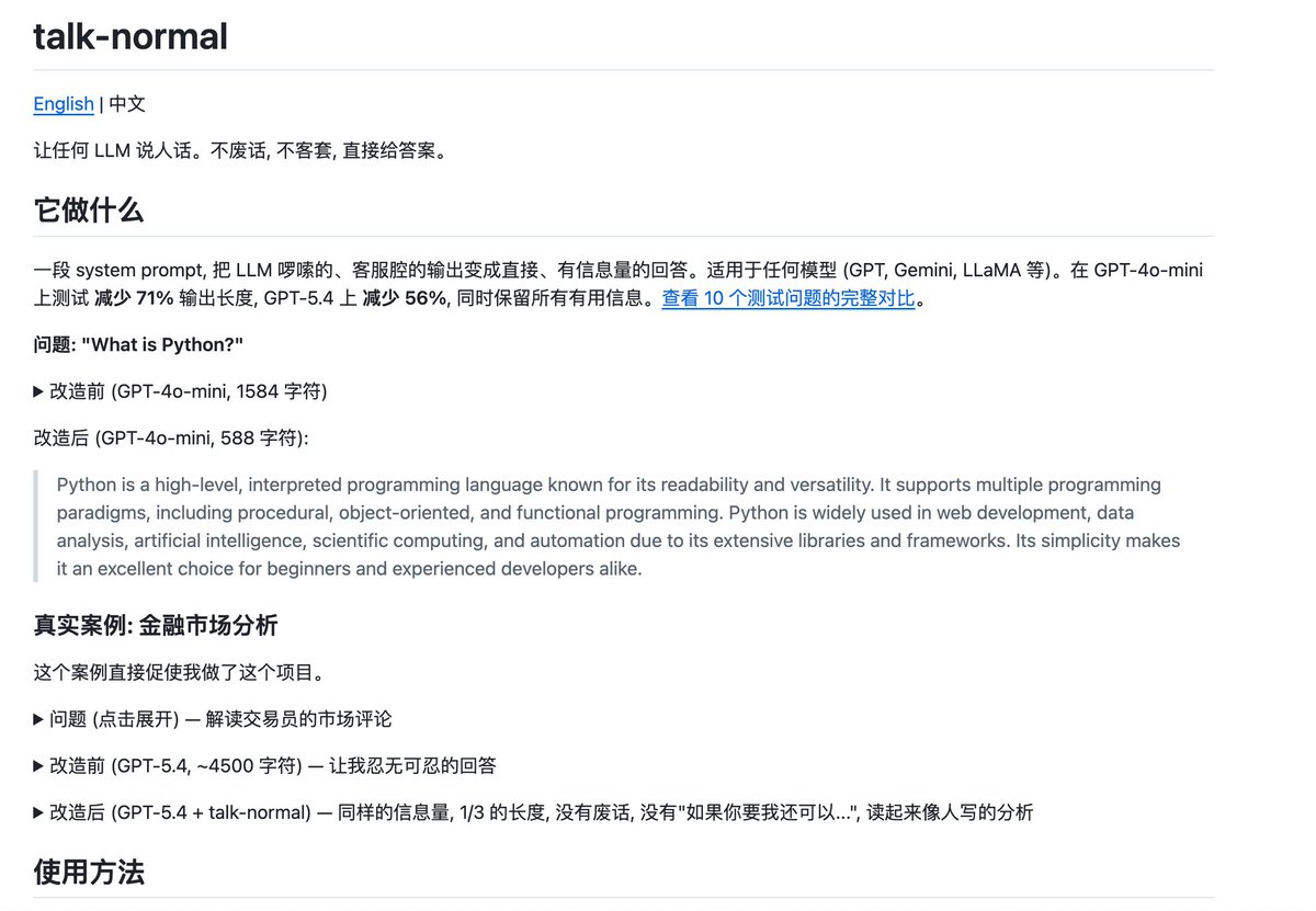 最近应该很多人跟我一样,由于claude不允许openclaw使用订阅,把openclaw的模型换到了gpt。但是gpt的AI味越来越让人无法忍受,经常一个简单的话题会发一大段排比句。所以我写了这段 prompt 来去除它的 AI 味, 让它不再说废话, 像 opus 一样好好说话。 安装很简单,直接把github链接发给openclaw,让它安装即可。安装完成后开启新对话生效。 github: https://t.co/9ituHxMq8x
