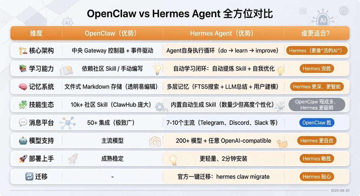 最近挺多人转向 Hermes Agent ,个人觉得对开发者和研究人员比较友好 Hermes Agent是由 Nous Research 在今年 2 月底开源的 AI 智能体框架,与OpenClaw都是自托管的开源智能体,都能接入 Telegram、Discord、Slack、WhatsApp 等聊天平台,都支持多模型切换,都走 MIT 协议。 但Hermes Agent 最大的特点是内置学习循环:每次完成任务后,它会自动从经验中提炼出可复用的 Skill,存入持久记忆,下次遇到类似任务时会自动改进和调用。 这个记忆是持久的,能逐步构建对你的“用户模型”。它是一个能自主成长的代理,常用于长期项目辅助、自动化任务、研究等。