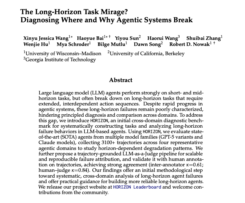 Do you know how your OpenClaw agent fails? The Long-Horizon Task Mirage? LLM agents seem capable… until tasks get long. Even extending a few steps can break them. In embodied tasks, 3–4 steps already fail. Real-world failures are happening. But we still don’t understand why.🤔 https://t.co/kVejvDT98r