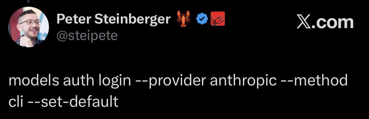 OpenClaw is 🔥 and Peter is GOAT Send this to your OpenClaw Agent: models auth login --provider anthropic --method cli --set-default This is so much fun! https://t.co/kUUdQFPN1F