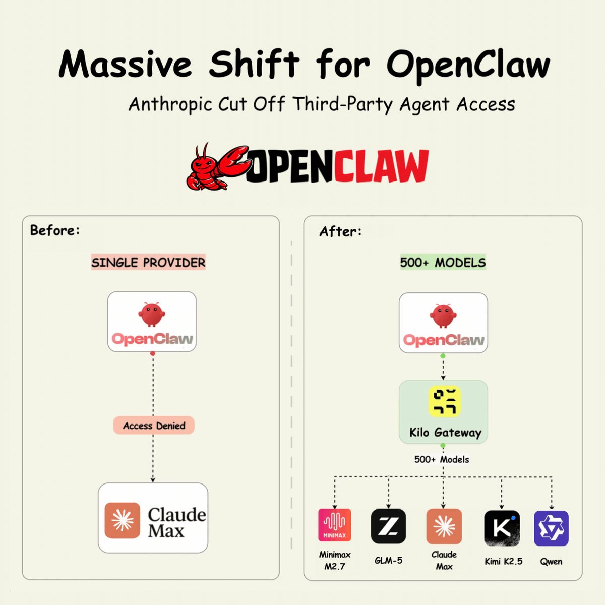 This is a massive shift for OpenClaw! Anthropic blocked third-party coding agents from Claude Max last week. If you were running OpenClaw on Claude Max, it stopped working. This isn't the first time. Cursor throttled heavy users. Every flat-fee AI plan eventually hits the same wall when agents run 24/7. Your OpenClaw setup still works. The workflows you built, the configs, the automation - all intact. What broke is the access layer, not the agent. This is where flexibility across models matters. Kilo Gateway fixes this. One endpoint, 500+ models. You're not locked to one provider. Kimi K2.5 for long context. GLM-5 for reasoning. MiniMax M2.5 for routine tasks. Qwen 3.5 for speed. Your agent doesn't care which model responds. You can still use Claude if you want. Or mix models based on the task. Your workflows don't break when one provider changes their rules. I've shared the link in the replies! 👉 Over to you: Should developers stop relying on single-provider subscriptions entirely?