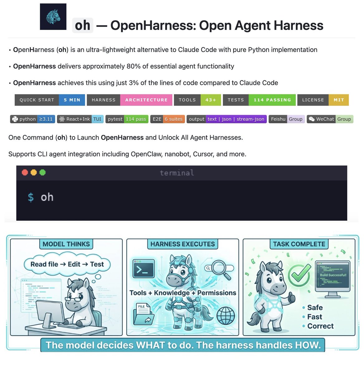 Introducing OpenHarness, an ultra-lightweight, pure Python alternative to Claude Code that delivers approximately 80% of essential agent functionality using just 3% of the code lines.