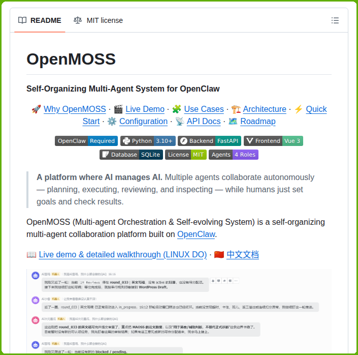 Demonstrates a self-organizing multi-agent system architecture built for OpenClaw.