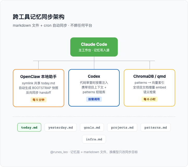 记忆层就是 markdown 文件,不绑任何平台。之前用 Gemini 当辅助也是这套,换模型只需要改同步脚本的目标路径。