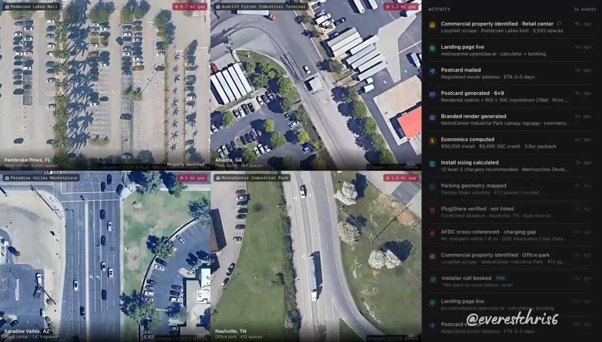 this OpenClaw bot scans every commercial parking lot in a city for missing EV chargers. when it finds one, it sizes the install on their actual lot, renders branded charging stations on the spot, and mails the owner a postcard, all on autopilot. here's how EV installers can close $100K–$400K commercial charger jobs before local incentive programs run out: - pulls every commercial property in a metro from public records - cross-references the national EV charger directory to find chargerless lots - captures the parking lot via Google satellite imagery - counts spaces + sizes the install using workplace charging benchmarks - computes the federal tax credit, state utility rebates, and payback in years - renders branded EV chargers on their actual parking lot with AI - prints a postcard with the before/after lot + ROI + QR code every step from property detection to mailbox runs without a human reply "EV" + RT and i'll send you the full guide so you can build this too (must be following so i can DM)