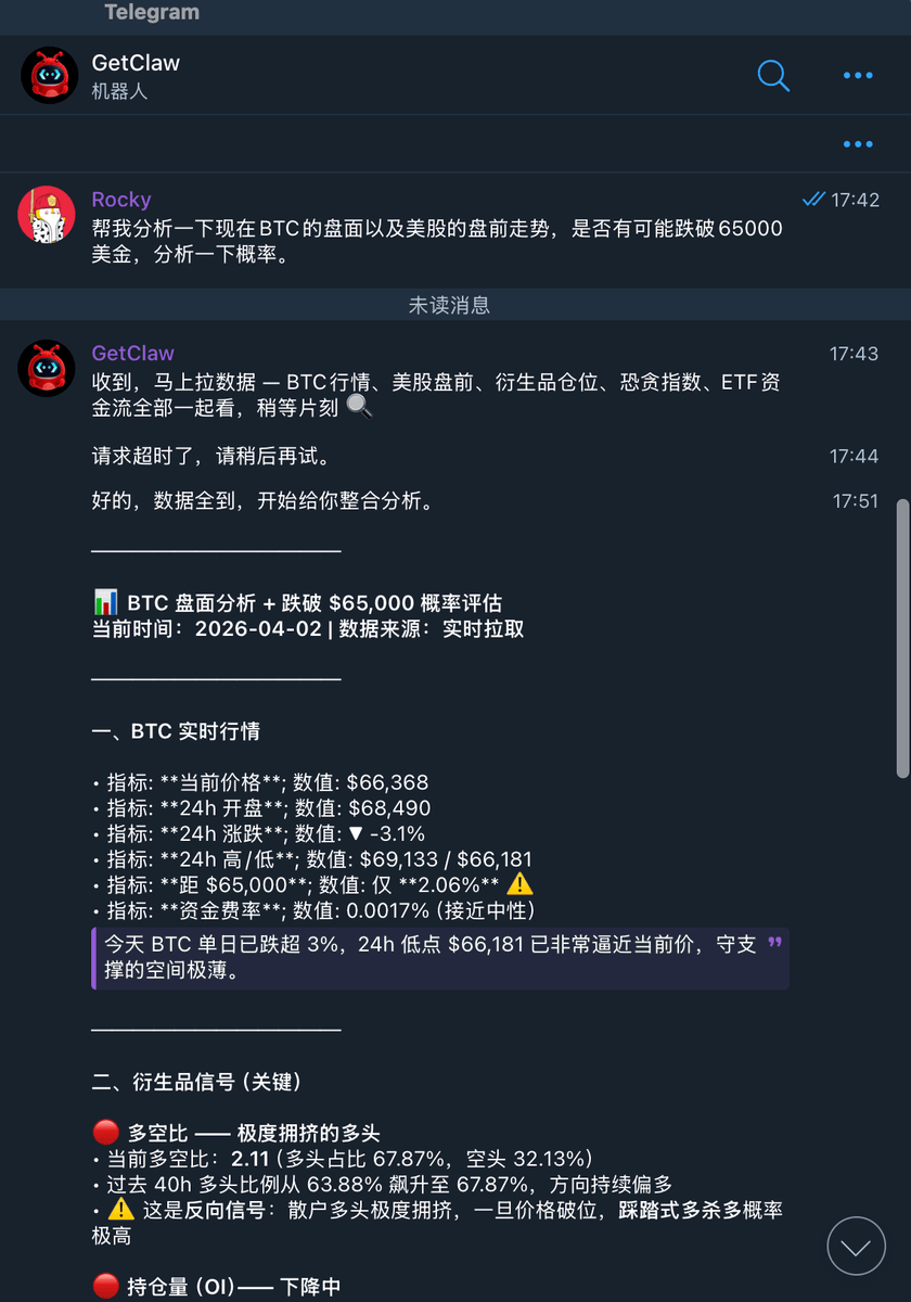 最近我一直在玩 #AI,也算是半个OpenClaw的骨灰级玩家,体验了各家交易所的Skills产品,讲真,目前体验感最好的当属 #OKX 和 #Bitget。今天我重点讲讲 #Bitget 家的GetClaw。 GetClaw算是我体验下来,直接就长在我的爽点上了。以前玩 OpenClaw,得自己整台mac mini或者租云服务器、配环境、配API,门槛其实有点高的。现在好了,Bitget 把这玩意儿直接搬到了云端,只要会用 Telegram 聊天,人人都能带个“AI 专业助理”进场交易。 为了让大家少走弯路,我把自己这段时间的私藏使用笔记整理了出来。咱们也不整那些虚的,直接让它在 #BTC 市场里搞钱。 🛠️ 我的 #GetClaw 私人笔记:半专业玩家的从0到1 1️⃣不要当搜索框,它是您的专业交易助理 很多人把小龙虾🦞当成查价格的工具,那就太浪费了。你要把它当成一个 7×24 小时不用睡觉、没情绪、执行力拉满的下属。 很多新手用户用法: “BTC 现在多少钱?”,这叫浪费资源。 我的用法, “帮我盯着 BTC,如果 4小时 K 线放量突破前高,立刻提醒我,并给出一份包含止损位的短线操作建议。” 2️⃣越模糊的时候,越要叫它干活 别等自己想明白了才去下单。我现在的习惯是,只要脑子里有个朦胧的想法,就先把它丢给 GetClaw,让它培养我的盯盘和交易习惯。 比如我经常,“我感觉最近 BTC 要变盘,你帮我复盘一下过去 48 小时的多空比和链上大额转账,看看我的直觉准不准?” 💡 #BTC 实战案例:三大场景教你稳如老狗 最近这行情,我基本都在做大币,主要都是BTC为主,我拿几个我最常用的场景给大家抛砖引玉: 场景一:深夜保镖 (自动化监控) 前不久我参加Bitget组织的塞班春令营,那边跟国内2小时时差,平时习惯了晚上9点半盯盘美股,在那边就11点半了,真的扛不住,我一般就会用GetClaw深夜保镖。 我的指令: “帮我盯着 BTC,如果半夜跌破65000,合约部分,先帮我平掉 50% 的空单仓位,剩下的设置移动止盈。另外现货帮我在65000买入0.5个BTC现货。别等我醒来,直接执行。” 深夜保镖,很好的给我做了风险管理。我最喜欢GetClaw的地方在于它能根据我的逻辑自动触发,而不是死板的限价单。 场景二:抄底狙击手 (技术信号共振) 行情急跌时,人容易恐慌,但 AI 不会。 我的指令: “持续观察 BTC,如果 RSI 跌进超卖区,且 1 小时级别出现底背离,帮我分批买入 0.1 个 BTC。” 我不需要时刻自己盯盘,也不需要Tradingview报警,基本上设置好我的技术指标需求,它就成了我全天候的狙击手。 场景三:横盘收割机(区间网格) 最近BTC走势,基本在65000—70000区间,横盘了1个多月了。真的磨死人了。 我的指令: “我看 BTC 最近就在 65000到 70000 之间晃悠。帮我在这区间跑个网格,高抛低吸,蚊子肉也是肉。但记住,一旦收盘价跌破 65000,立刻停掉策略并清仓换成U。” 这基本帮我免除了很多烦恼,自己跑网格,有时候忘记停,一旦出现大瀑布,亏的那不是一星半点。AI 基本帮我把震荡市的琐碎利润都抠出来,而且自带了安全开关。 🎁 上述就是我个人使用的一些小技巧,希望对大家有用,另外最近别错过这个羊毛,官方现在有个限时福利: 4月8日前,所有人都能白嫖价值 33U/月 的 Plus 会员权益。不用额外领,直接去 Telegram 搜「getclaw_official_bot 」启动就行。 最后我的建议,先别急着投大钱,先让它帮你盯盘、分析。等习惯了这种“AI + 交易”的节奏,再操作不迟,最终会发现以前那种手动盯盘、拍脑门决策的日子,真的是太累了。 先用先享受,祝大伙们在 #BTC 的浪潮里,稳如泰山,收割全场!加油!🥸