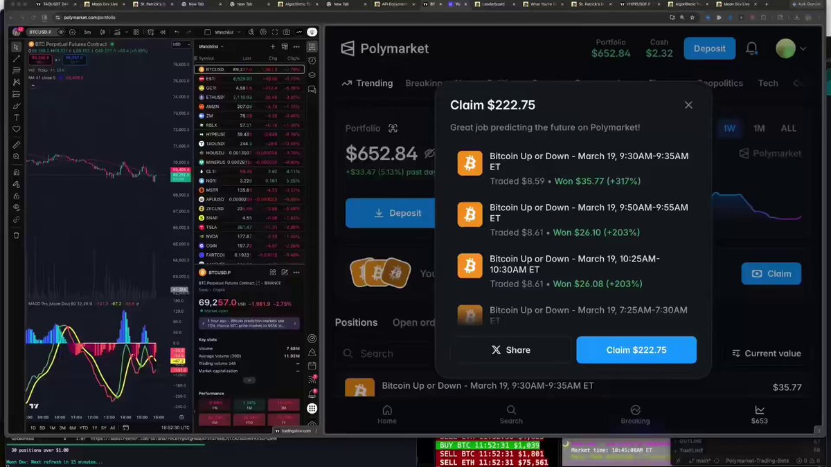 Demonstrates an automated trading setup using Claude Code, OpenClaw, and Polymarket to generate week