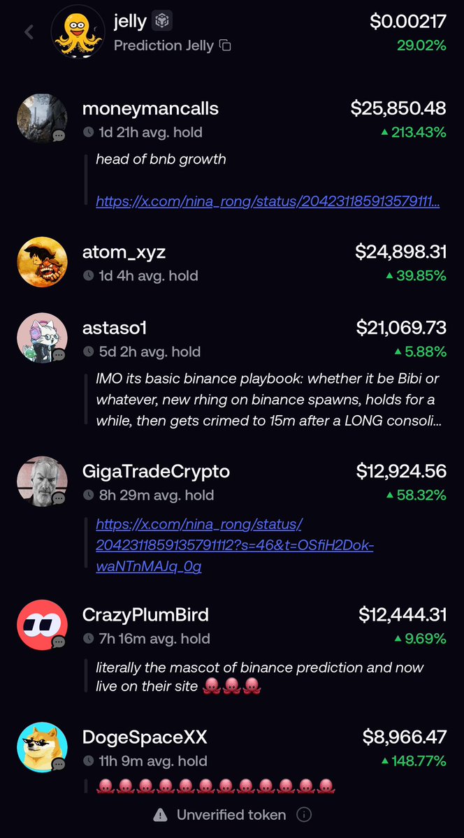 $jelly 🐙🐙🐙 盘点币安人生之后 #Binance 上过的meme合约 第一个 我踏马来了 第二个 龙虾 都有一个共通点就是动物,一个马一个龙虾,章鱼🐙这个角度真的很好! 今天看了一下Fomo,里面很多老外进场jelly,刚刚进的astaso1直接打突破,我看他钱包是sol上Buttcoin大户,眼光还是非常牛逼的。 等币安功能上线 你们打开币安看见🐙图标的时候就知道jelly是什么东西了。 这小章鱼🐙给我第一感觉就是牛逼 离世界杯那么近,谁不想吃预测市场的蛋糕 0xf581ee357f11d7478fafd183b4a41347c35a4444