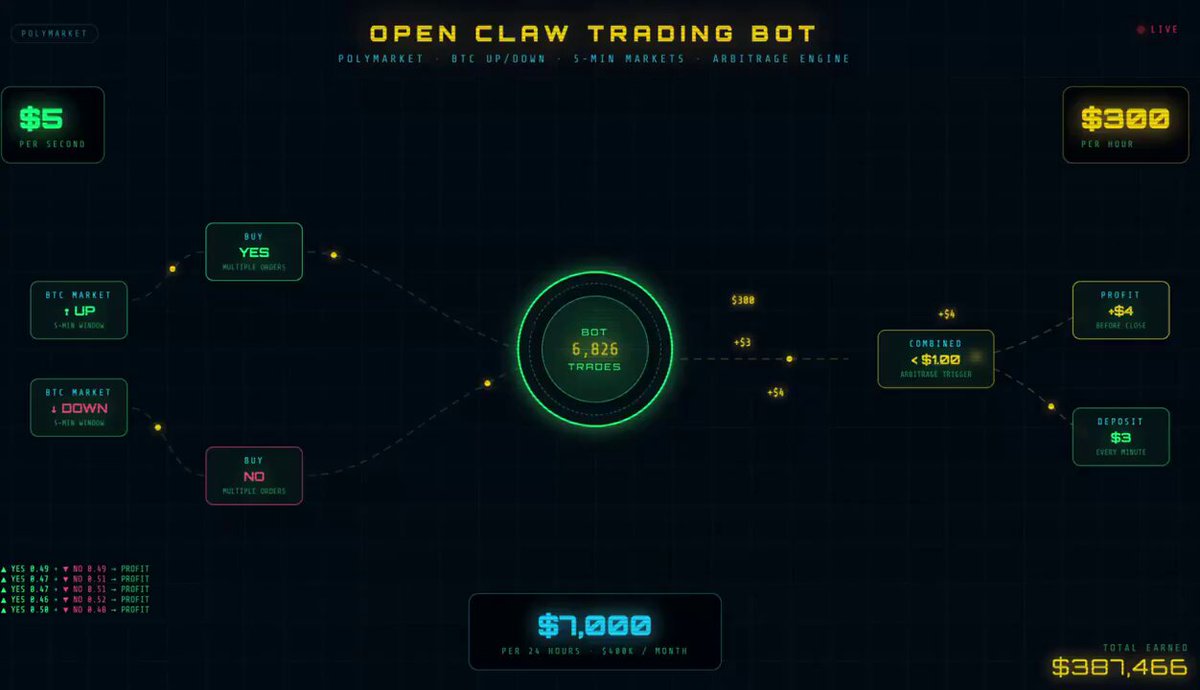 An OpenClaw bot executes high-frequency arbitrage on 5-minute BTC binary options by exploiting struc
