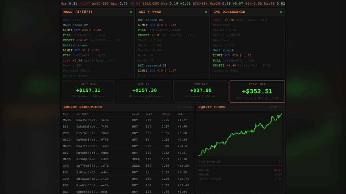 AI-generated deployment of three automated crypto trading bots (momentum, reversal, divergence) yielding significant daily returns.