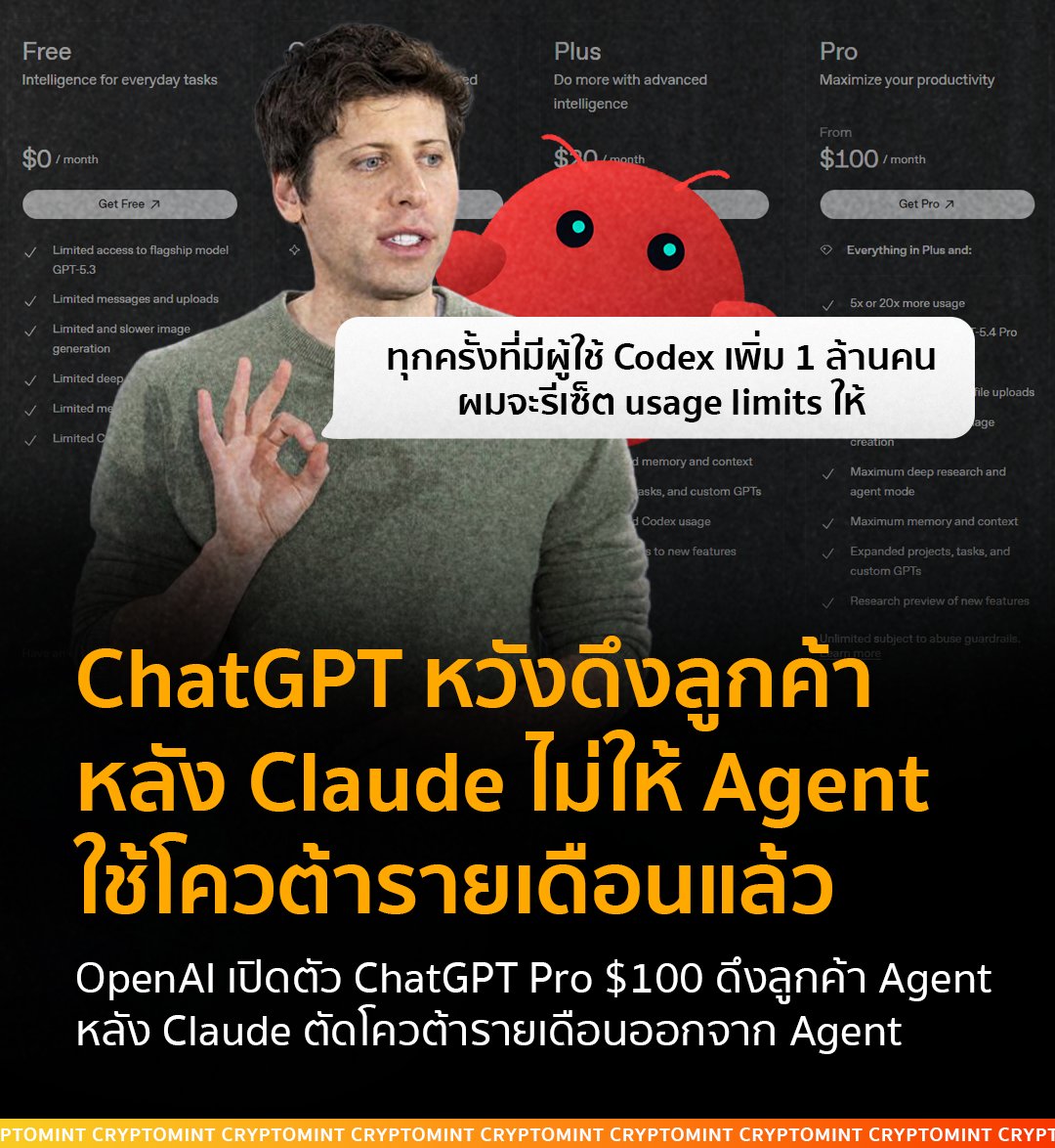 สำหรับคนที่ใช้ OpenClaw หรือ Hermes แล้วเจอปัญหาโควต้า Claude หมดก่อนสิ้นเดือน . เพราะตอนนี้ Anthropic เปลี่ยนนโยบายไม่ให้ agent อย่าง OpenClaw และ Hermes ใช้โควต้ารายเดือนของ Claude ได้อีก . เปลี่ยนไปใช้ extra usage credits แยกต่างหากแทน ทำให้ค่าใช้จ่ายอาจสูงกว่าค่าสมัครรายเดือนที่เคยจ่ายอยู่มาก . OpenAI เพิ่งปรับ ChatGPT Pro และ Plus ใหม่ในในช่วงเวลาเดียวกัน ซึ่งหลายคนมองว่าเป็นการรุกตลาด AI Agent โดยเฉพาะ . Sam Altman ถึงกับประกาศ reset rate limits ให้ผู้ใช้ทุกครั้งที่มีผู้ใช้ Codex เพิ่ม 1 ล้านคน จนกว่าจะถึง 10 ล้าน . Plus $20 ปรับโควต้าจากใช้หนักในวันเดียว เป็นกระจายออกตลอดสัปดาห์แทน เหมาะกับการใช้งานทั่วไป แต่ถ้าใครชอบรันงานยาวในวันเดียวจะรู้สึกโควต้าหายเร็วกว่าเดิม . Pro $100 คือ tier ใหม่ที่เพิ่มเข้ามาระหว่าง Plus และ Pro $200 (น่าจะเอามาแข่งกับ Claude ในช่วงของ Ai Agent โดยตรง) - ใช้ Codex ได้มากกว่า Plus 5 เท่า (มีโปรโมชันถึง 31 พฤษภาคม 2026 ขยับเป็น 10 เท่าชั่วคราว) - เข้าถึง model รุ่น exclusive และ Thinking models แบบไม่จำกัด - ส่วน Pro $200 ยังอยู่และให้โควต้าสูงกว่า Plus ถึง 20 เท่า . ที่น่าสนใจคือ Codex กำลังโตเร็วมาก ตอนนี้มีผู้ใช้รายสัปดาห์กว่า 3 ล้านคนแล้ว เพิ่มขึ้นเกือบ 5 เท่าในช่วง 3 เดือน และยังโตต่อเนื่องกว่า 70% ต่อเดือน . ขณะเดียวกัน Peter Steinberger ผู้สร้าง OpenClaw ย้ายไปทำงานที่ OpenAI ตั้งแต่เดือนกุมภาพันธ์ 2026 เพื่อดูแลกลยุทธ์ด้าน personal agent และได้พูดถึงข้อได้เปรียบของ OpenAI ที่ไม่ได้จำกัดการใช้งานผ่าน agent แบบเดียวกับที่ Anthropic ทำ . สิ่งที่ต้องจับตาต่อไปคือหลังโปรโมชัน 31 พฤษภาคมสิ้นสุด ผู้ใช้ที่ลองใช้ tier $100 จะอยู่ต่อหรือไม่ และ Anthropic จะตอบโต้อย่างไรกับการเคลื่อนไหวครั้งนี้มั้ย?