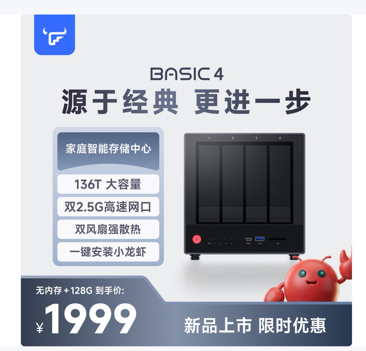 飞牛NAS 新品 EVO4 来了 首款四盘位 支持4×3.5英寸硬盘 最高144TB容量 搭载英特尔N150处理器 配备5GbE+2.5GbE双网口、10Gbps USB及HDMI输出 无内存版+128G 1999元起 还可以养小龙虾🦞 https://t.co/35EGDyV1QA