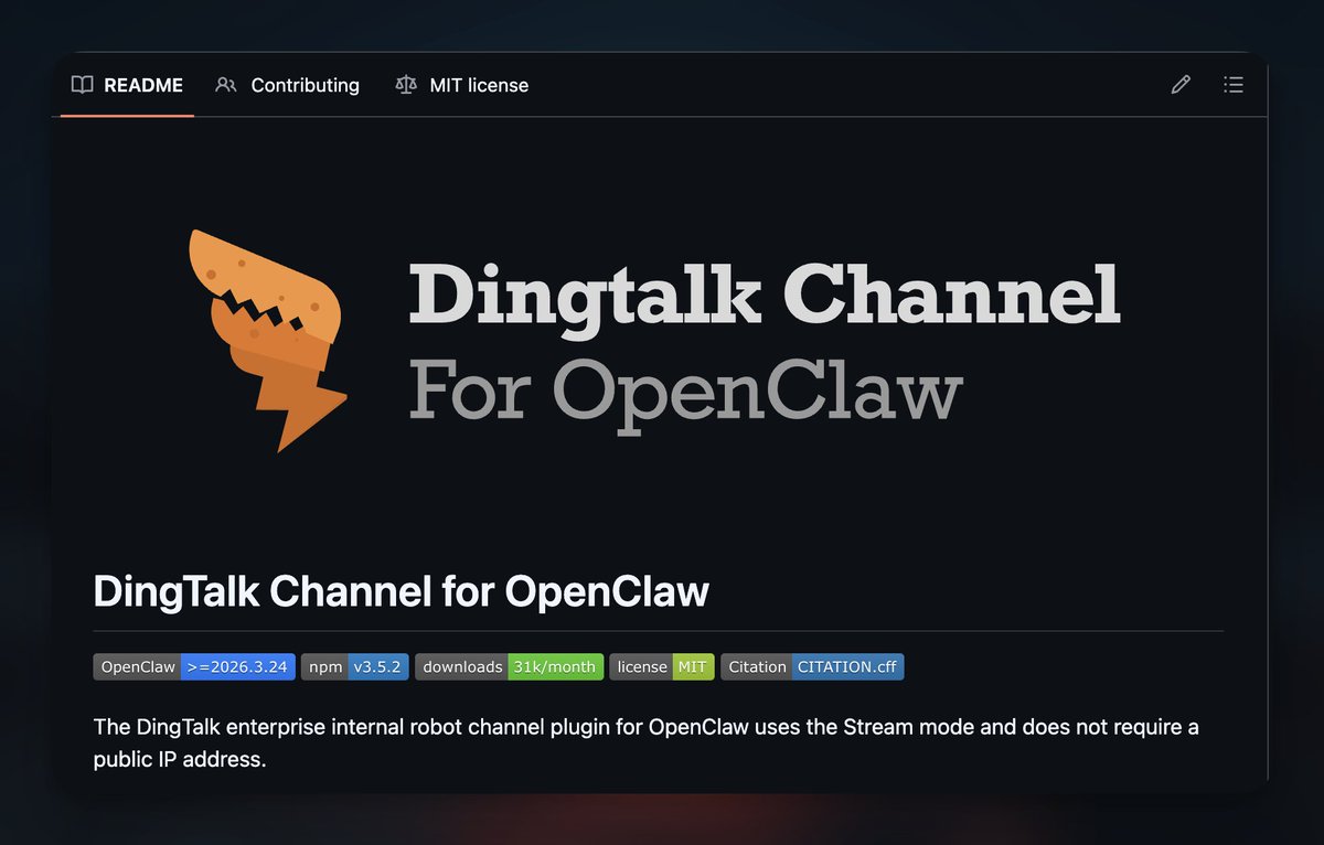 Turn your dingtalk group into an automated ai assistant channel. - Stream mode, no need for webhooks or public network access. - Supports private chat, group chat, and @bot. - Supports text, images, voice, video, files, and DingTalk document/file cards. - Supports Markdown replies and AI card-based streaming replies. - Supports multiple agents, multiple bot bindings, and experimental features. - Integrate OpenClaw message processing and outbound capabilities