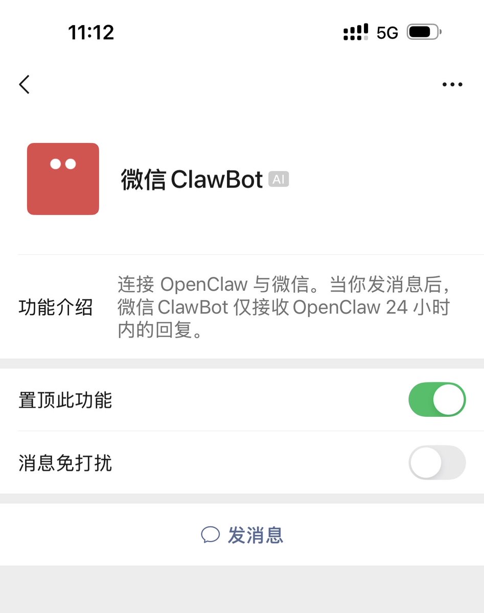 微信今天推出了ClawBot,龙哥威武! 这么理解这个呢,其实这完全不是腾讯新的龙虾产品,而是你可以通过插件的形式,让你在任何地方的龙虾可以和微信进行通话。也就是相当于你的微信列表里多了个叫「微信Clawbot」的好友。 首先安装和连接这个有三个小细节: 1、你的微信需要更新到最新的版本,以及现在似乎只有iOS更新了,安卓可能还要等等 2、Clawbot在微信设置的「插件」里,但你没必要去点开,也不是测试状态,理论上所有人都可以连接了,我一开始还误解了以为插件里没显示Clawbot就不能用,这是个巨大的误解。 3、你用下面一个命令在终端安装就可以了👇 npx -y @tencent-weixin/openclaw-weixin-cli@latest install 如果你不会或者遇到问题的话,也可以像我一样,如图4发给Claude Code等AI编程工具自动帮你处理,或者交给你的龙虾就好了。 那个命令安装好其实就是给OpenClaw提供了一个新的插件,就和连接飞书或者钉钉是一个意思。 接下来你会获得一个二维码,用微信扫码就能连接完成了✅